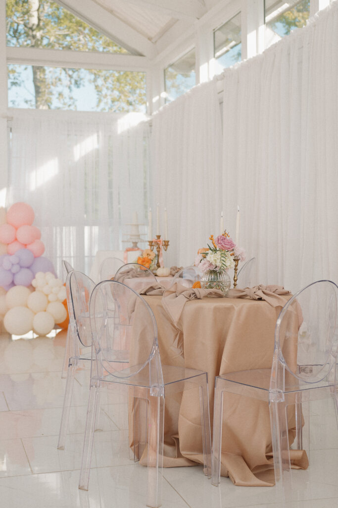 The best part? Nothing about it felt cheesy. It was thoughtful and pretty, but still totally embraced the Halloween spirit. Everywhere you looked there were those clever little details that make you smile — pastel pumpkins scattered throughout, charming ghost motifs peeking out in the décor, soft textures, warm lighting, and a color palette that turned Halloween into something sweet instead of spooky.